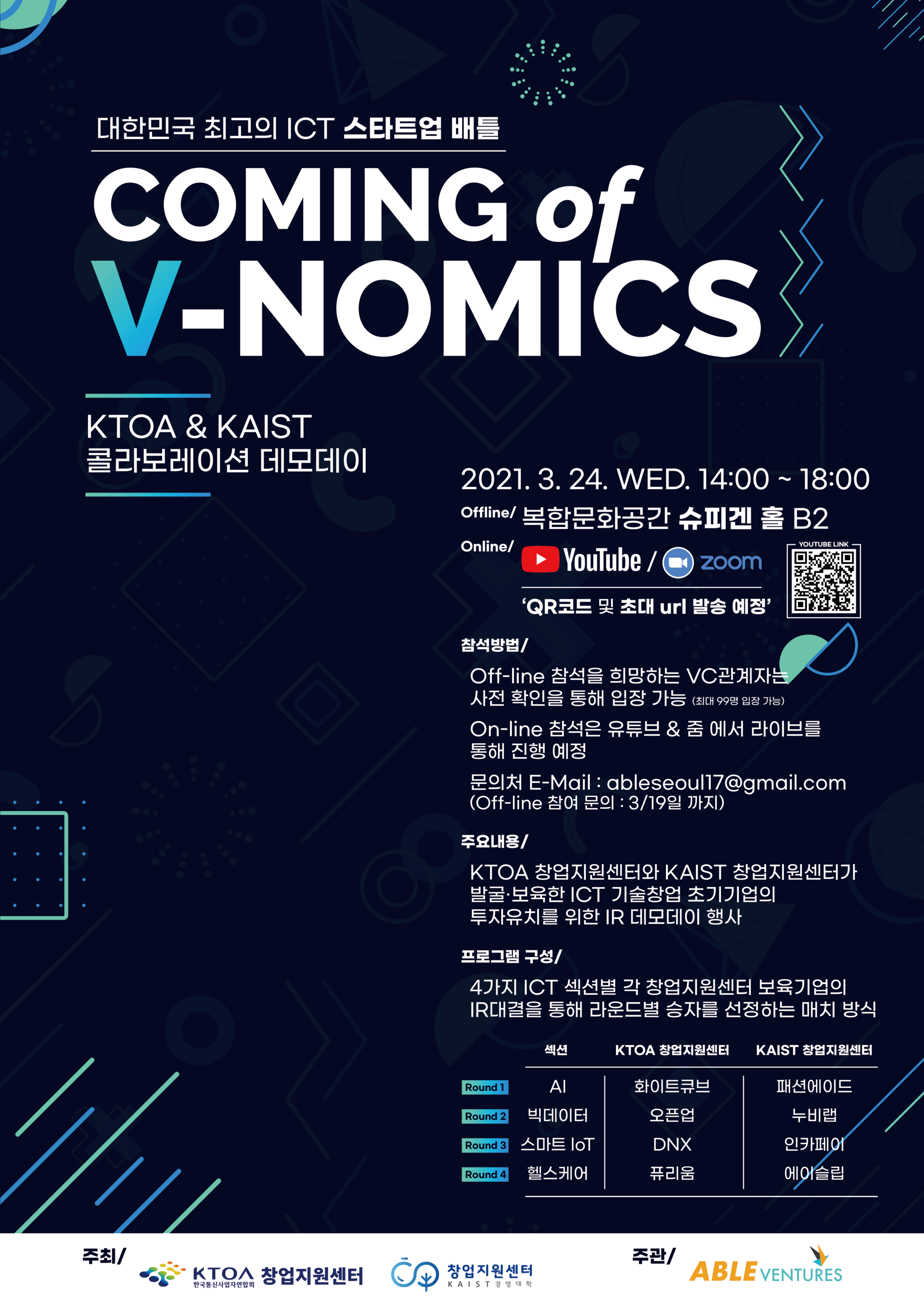 - 장소 : 슈피겐 홀 B2 / 온라인 중계 - 4가지 ICT 섹션별 각 창업지원센터 보육기업의 IR대결을 통해 라운드별 승자를 선정하는 매치